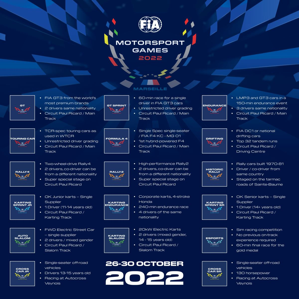 - Les FIA Motorsport Games feront leur retour à l'automne prochain au Paul Ricard et dans toute la région autour de Marseille. Nouveauté en 2022, la catégorie Endurance proposera une épreuve longue distance de 150 minutes avec des LMP3 et GT3. L'épreuve de sprint pour les pilotes professionnels viendra également compléter la GT Cup à deux pilotes, qui conservera sa philosophie de notation des pilotes Pro-Am.