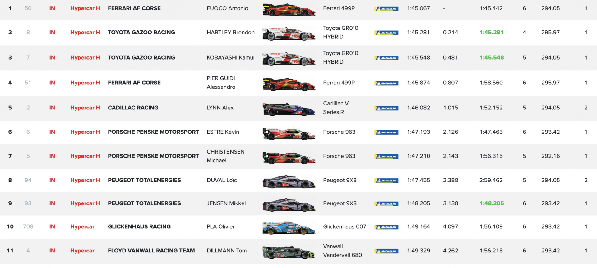 Le premier chrono significatif est signé par Loïc Duval, au volant de la Peugeot n°94 en 1'51''858. Mais sans grande surprise, le Français est rapidement délogé par Brendon Hartley (Toyota n°8) puis par Michael Christensen (Porsche 963 n°5), qui s'empare du meilleur temps en 1'47''387.