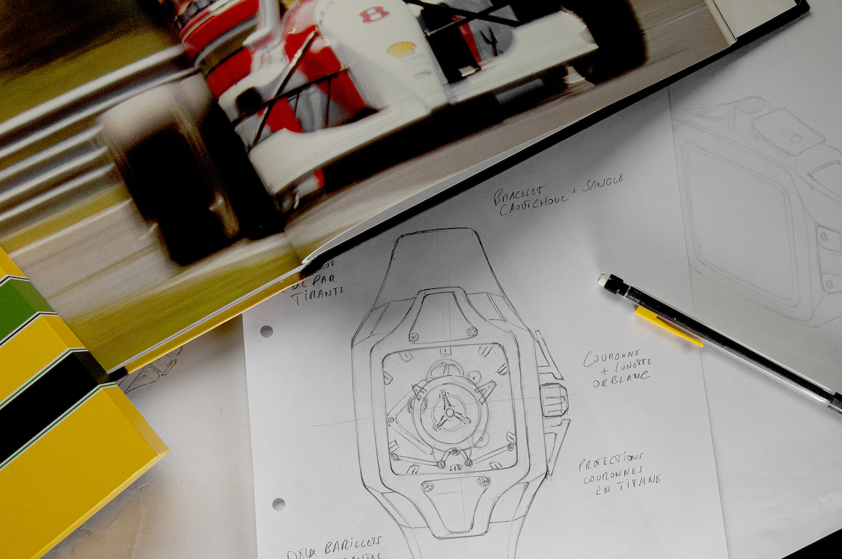Évidemment, Lorige a voulu imprégner la pièce de certains codes et détails de l’univers auquel elle se réfère. Ainsi, le tourbillon est placé au centre de l’ensemble tout comme le pilote dans une automobile, les deux barillets adoptent le design esthétique des jantes Speedline de l’époque, et la fixation du mouvement s’effectue par des « tirants », comme ceux des trains roulants de monoplaces. À cela s’ajoutent des clins d’œil à l’histoire, par exemple, les trois championnats du monde de Formule 1 du pilote brésilien sont gravés dans la cage supérieure en titane du tourbillon, mais aussi les rappels du jaune de son casque mythique, et la réserve de marche de 93 heures fait même référence à l’année des freins en carbone/carbone utilisés pour façonner les boîtiers. La lunette en or gris rappelle également les courbes des F1 des années 90. Tant de détails qui lui donnent tout son caractère, que l’on peut découvrir au fur et à mesure en parcourant cette pièce spectaculaire.