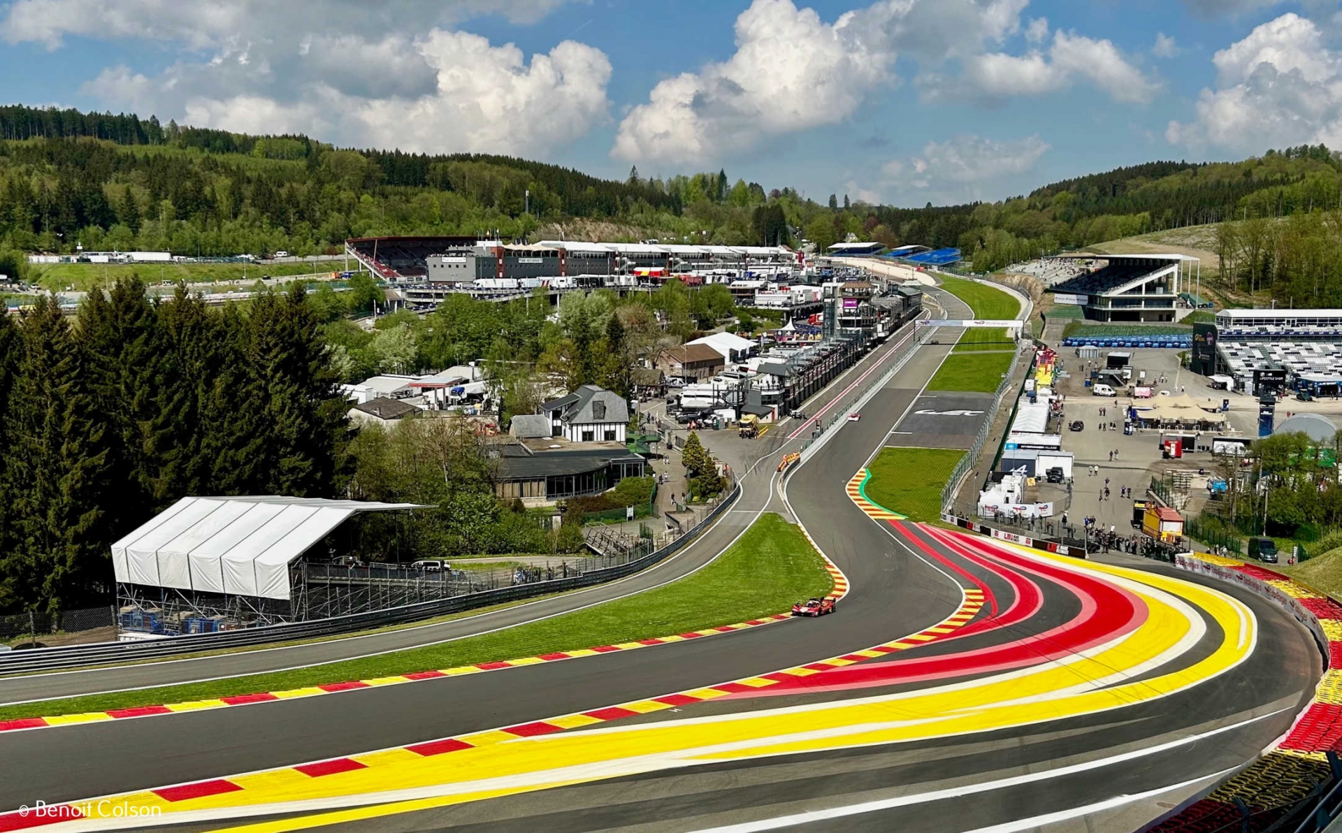 Nous vivons le début de la première séance d’essais libres depuis la tribune du Raidillon. « What else ? », aurait-on envie de dire. J’ai connu les gradins en béton du Raidillon dans les années 80 et 90, ils m’ont beaucoup manqué quand ils ont été démolis et remplacés par ... rien, mais la nouvelle tribune a été très bien conçue et donne une vue incomparable sur ce qui reste selon moi une portion légendaire de circuit automobile malgré tout.