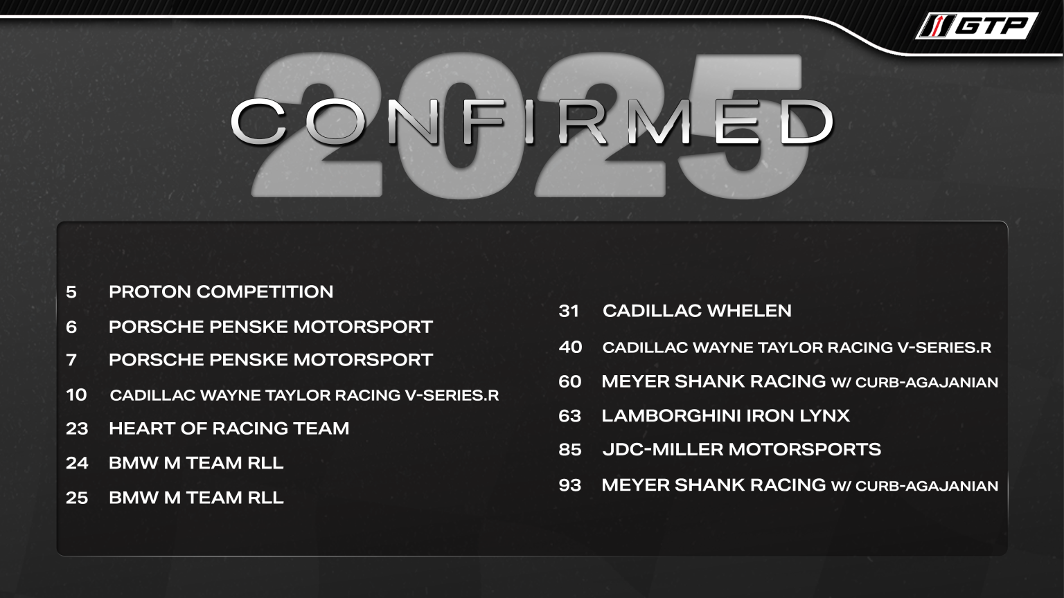 La grande nouveauté de la campagne à venir sera, comme nous le savons depuis un certain temps maintenant, la présence en GTP d'une Valkyrie alignée par le Heart of Racing Team, première LMH à s'inscrire dans la série. Voilà qui portera à six le nombre de constructeurs engagés dans la catégorie-reine, Aston Martin rejoignant Acura, BMW, Cadillac, Porsche et Lamborghini.