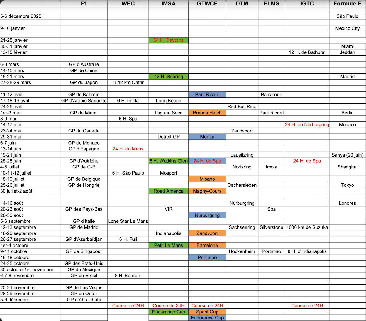 Avec la confirmation des calendriers des principaux championnats majeurs en vue de la saison 2026, il apparait désormais intéressant de voir quels seront les conflits de date (ou non) à venir pour la prochaine campagne. Entre le WEC, l'IMSA, le GT World Challenge Europe, le DTM, la Formule E, mais aussi la Formule 1.