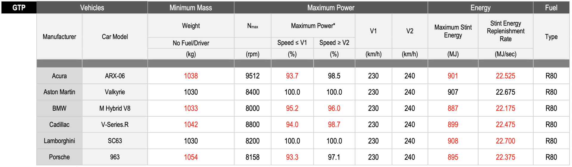 Aucun changement n'a été apporté aux BoP de la Lamborghini SC63 et à l'Aston Martin Valkyrie, qui demeurent à l'extrêmité basse de la BoP : 1030 kg et 520 kW.
