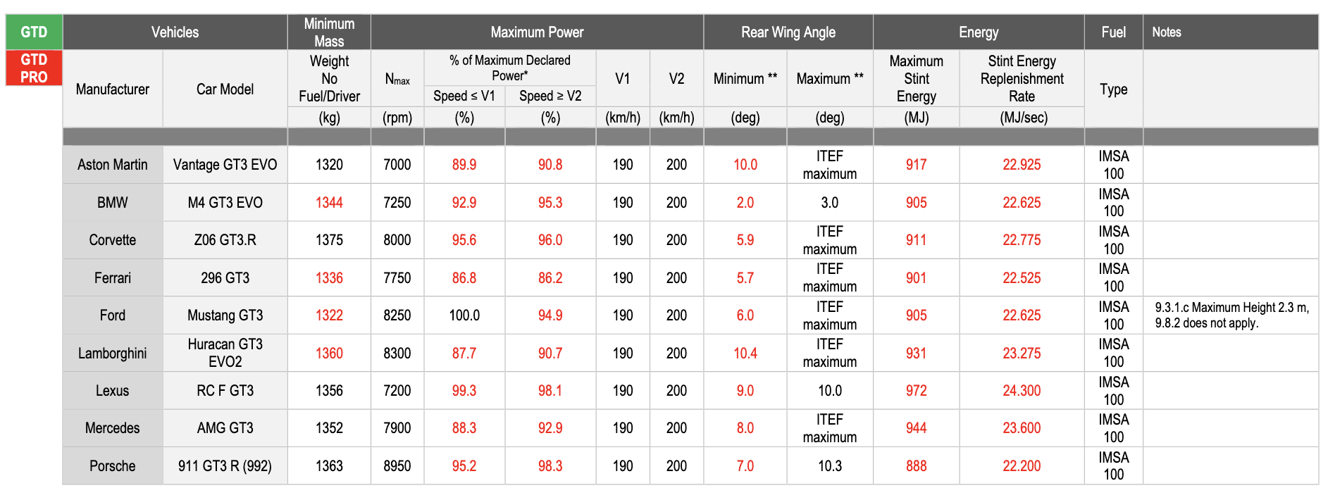La Corvette Z06 GT3.R gagne 4,1% avant 190 km/h et 0,2% après 200 km/h. La Ford Mustang conserve sa puissance maximale avant 190 km/h et récupère 0,8% après 200 km/h, alors que la Porsche 911 GT3 R prend 2% avant 190 km/h et 0,6% après 200 km/h. Chez Ferrari, la 296 GT3 gagne 3,9% avant 190 km/h et 1,6% après 200 km/h) et