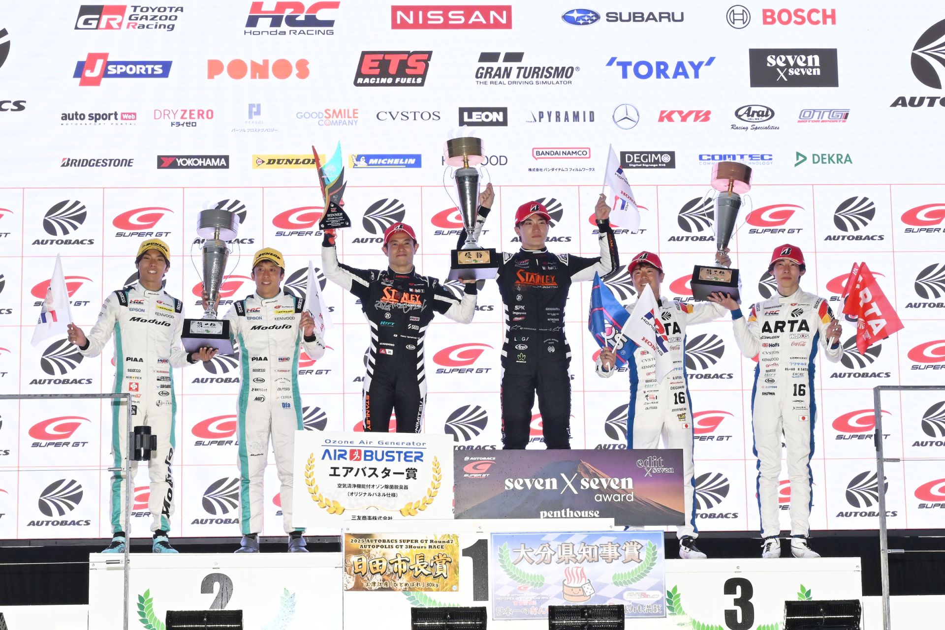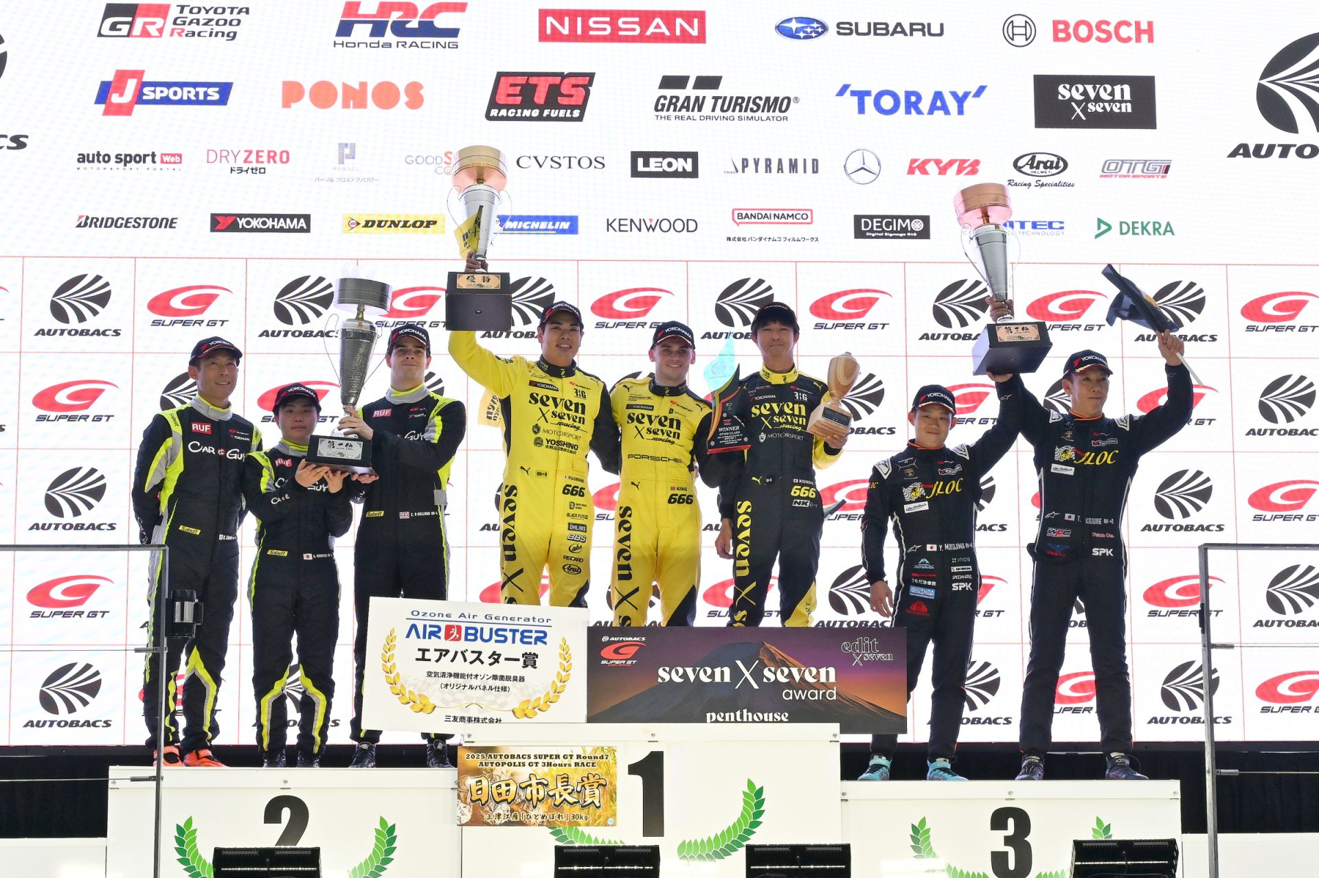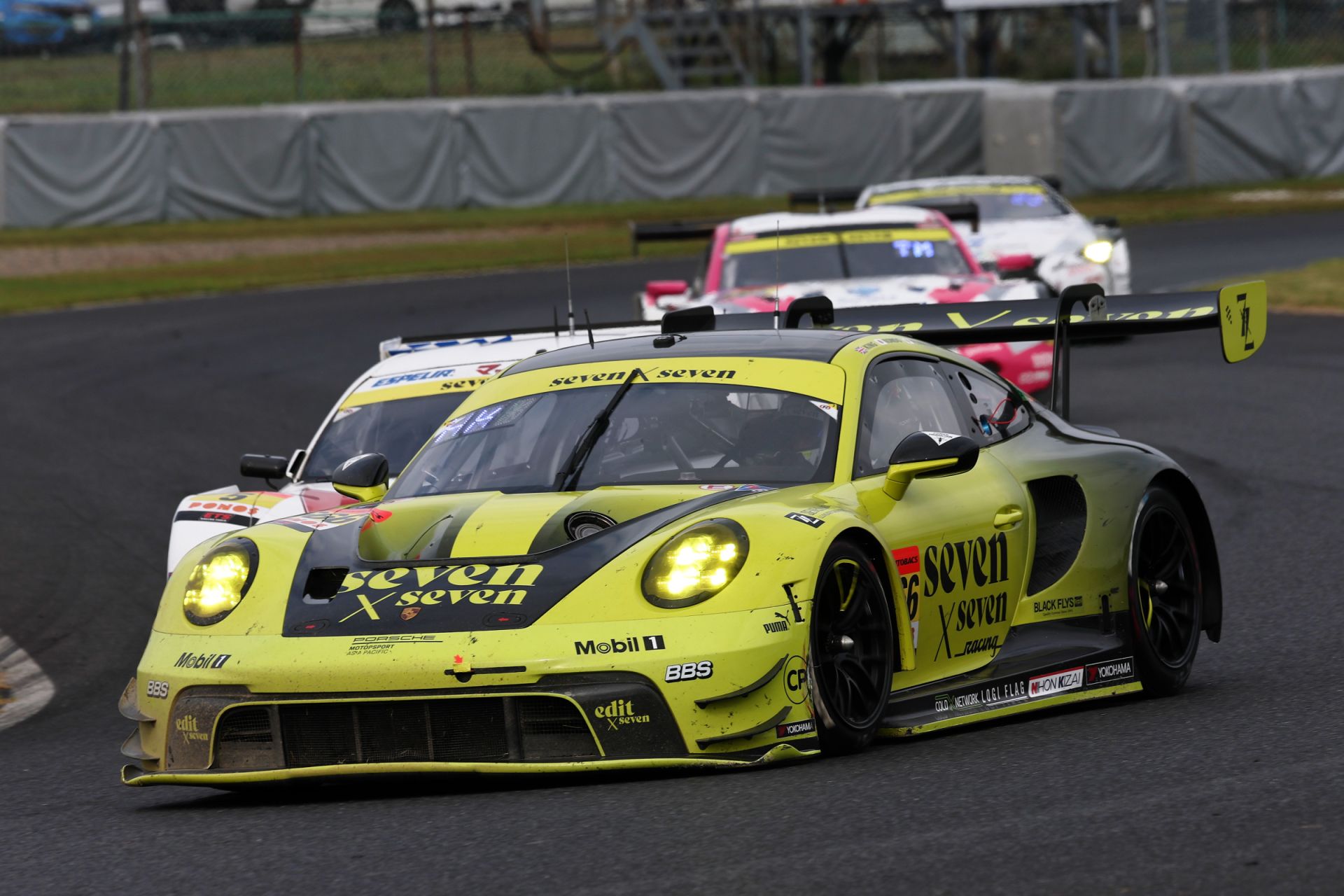 En GT300 la Ferrari Car Guy #7 et la Lamborghini JLOC #0 ont bataillé pendant la quasi-totalité de l’épreuve pour la victoire avant d’écoper coup sur coup de pénalités qui ont remis dans le jeu Harry King sur la Porsche #666, jusque-là lointain troisième. Rikuto Kobayashi, sur la Ferrari, paraissait cependant en mesure de l’emporter avant de devoir plonger à quelques tours du but dans la pitlane pour un splash & go, offrant à King et au team Seven x Seven de Kiyoto Fujinami leur première victoire en GT300, et la première victoire à Porsche dans la catégorie depuis 2013. Takashi Kogure et Yuya Motojima sauvent la troisième position sur la Lamborghini Huracan GT3 Evo2 #0.