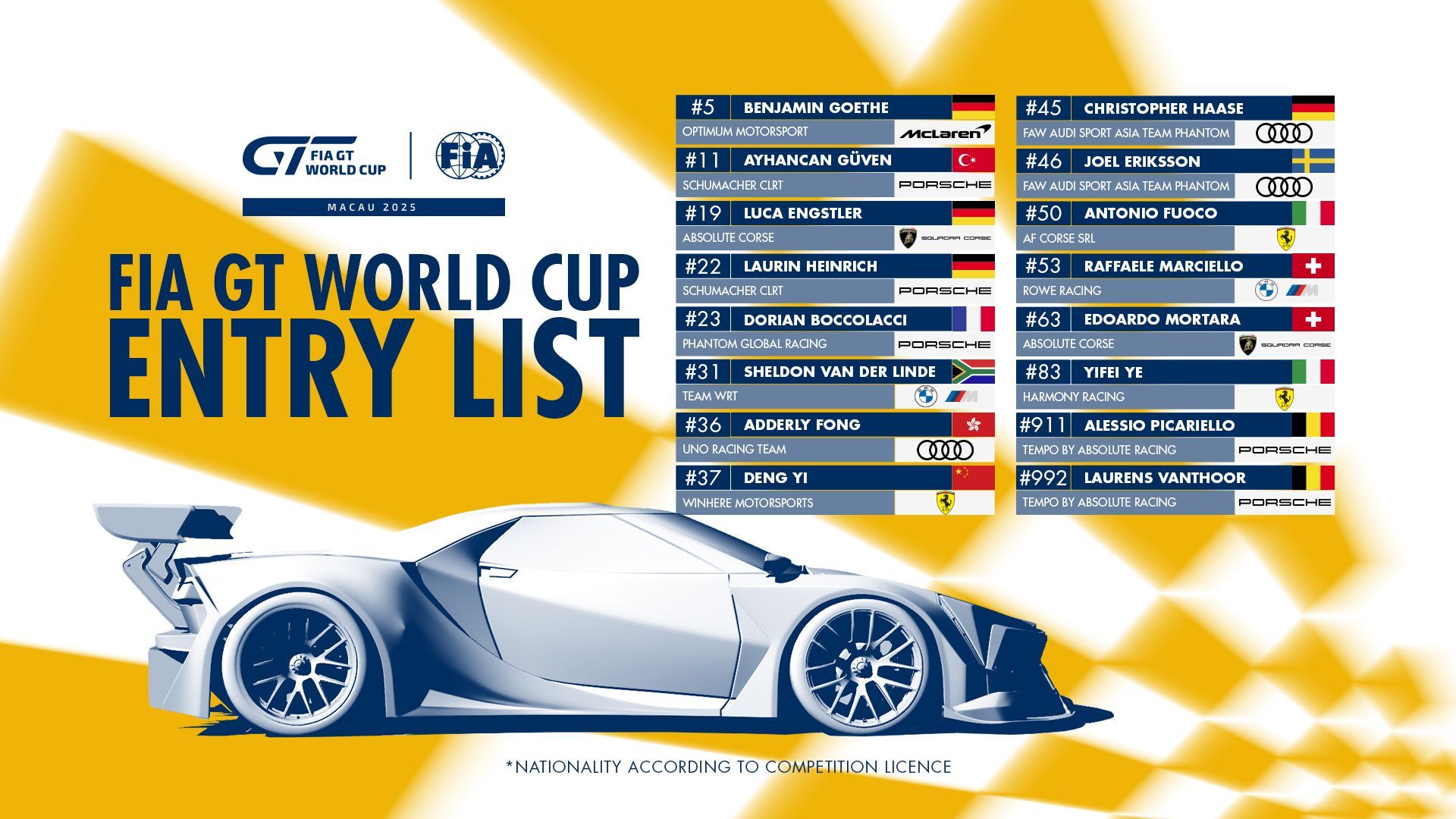 Seize GT3 sont attendues au départ de l'édition 2025 de la Coupe du Monde FIA GT de Macao, disputée sur le tracé de Guia (13-16 novembre) dans le cadre du 72e Grand Prix de Macao. Une grille en diminution par rapport à 2024, où 22 voitures étaient présentes.