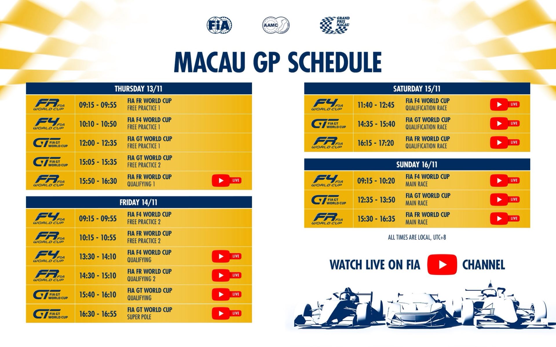 Les qualifications, la Superpole et les deux courses seront à suivre en direct vidéo sur Endurance-Info via le flux Youtube FIA ou l'ensemble du meeting via le flux Youtube du Grand Prix de Macao