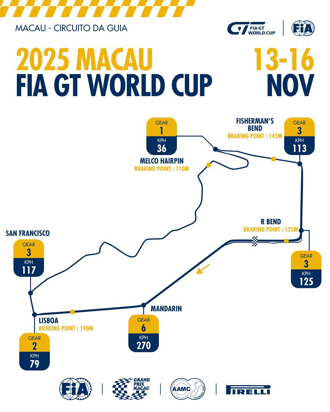 Long de 6,120 km, le circuit de Guia est l'un des plus prisés des pilotes. « Rouler à 270 km/h entre les murs, c'est rare en sport auto » nous confiait il y a quelques jours Kévin Estre. Offrant un mixte de longues lignes droites et de virages serrés, il permet aux pilotes d'atteindre des vitesses très élevées, ce qui est rare pour un circuit urbain. Autre particularité, son dénivelé, puisque 30 mètres séparent le point le plus haut du point le plus bas.
