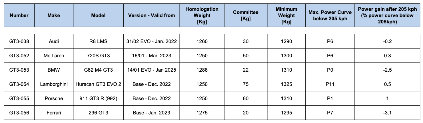 © Porsche Media - La première version de la Balance de Performance de l'épreuve affiche les valeurs suivantes pour les GT3 présentes sur cette édition.