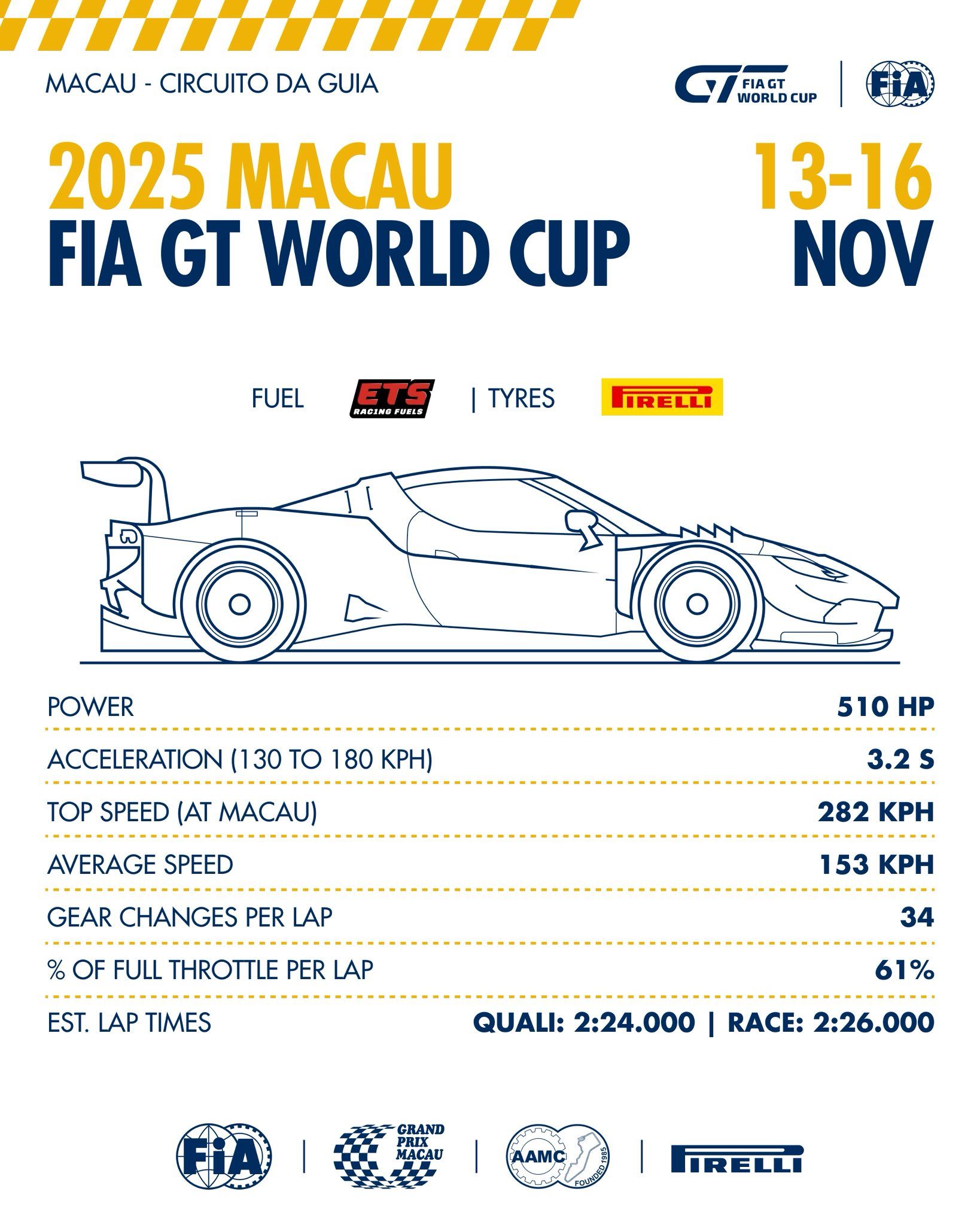 - Pirelli demeure le fournisseur de pneus exclusif de l'épreuve GT3 avec les gommes DHG qui font leurs débuts de le circuit de Guia. Les pneus arboreront un design spécifique avec un dragon jaune peint sur un fond rouge. Pirelli fournit aussi les pneus pour la FIA Formula Regional World Cup et la nouvelle FIA Formula 4 World Cup.