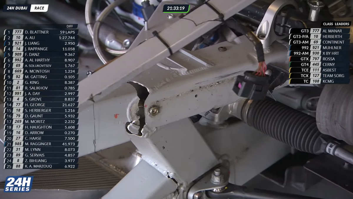 - En lice pour le podium au général et la victoire en Am, la BMW n°992 - Paradine Competition de Darren Leung, James Kellett, Ahmad Al Harthy, Steven Gambrell et Anthony McIntosh n'a finalement pas vu l'arrivée après la crevaison subie en piste et un disque de frein explosé. L'équipe a finalement préférer ne pas relancer la voiture après avoir étudié l'ampleur des dégâts.