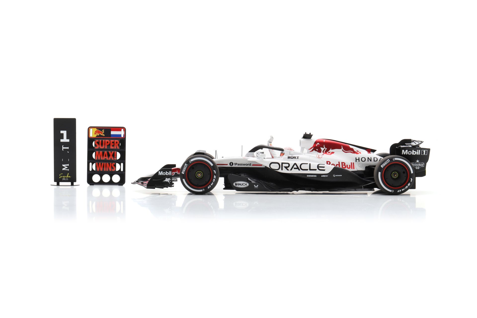 Alors que Honda ne sera plus le motoriste de Red Bull en 2025, comment ne pas marquer son dernier passage au Grand Prix du Japon. Un changement de livrée d’autant plus apprécié que Max Verstappen s’est imposé faisant honneur au drapeau japonais. Un modèle disponible aussi bien au 1/43 qu’au 1/18 (réf. 18S1004).