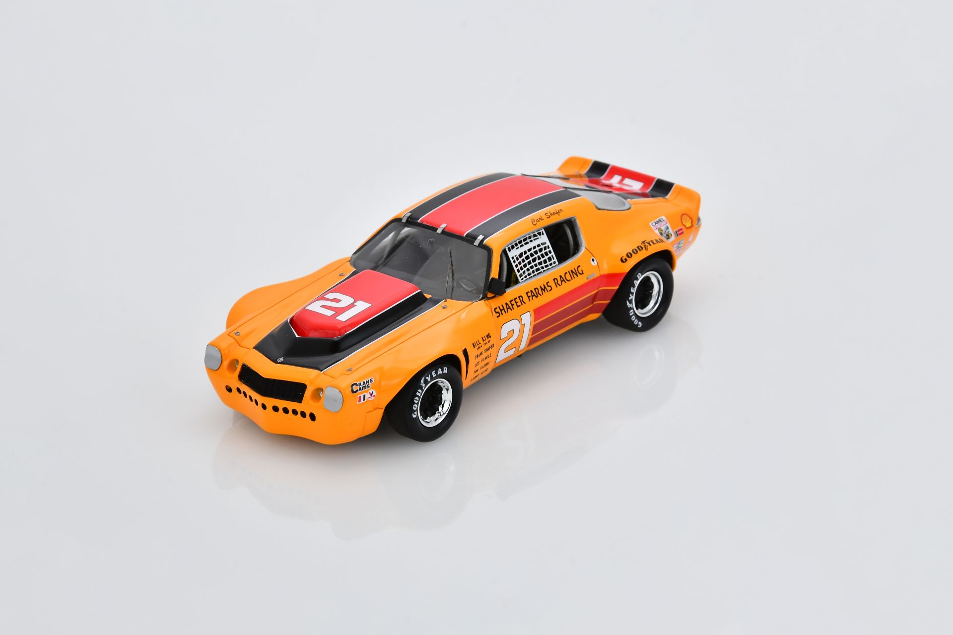 En 1975, inquiet devant la profusion des Porsche 911, l’IMSA créa une catégorie All American GT dont les Corvette Greenwood, les Chevrolet Monza ou cette Camaro sont des exemples. Développée par Carl Shafer autour d’un V8, d’un châssis tubulaire et d’une carrosserie aux extensions impressionnantes, elle anima la série avec plus ou moins de succès. La voici dans la version Mosport 1975 où elle termina deuxième. Vivement la Cobra II de Charlie Kemp.