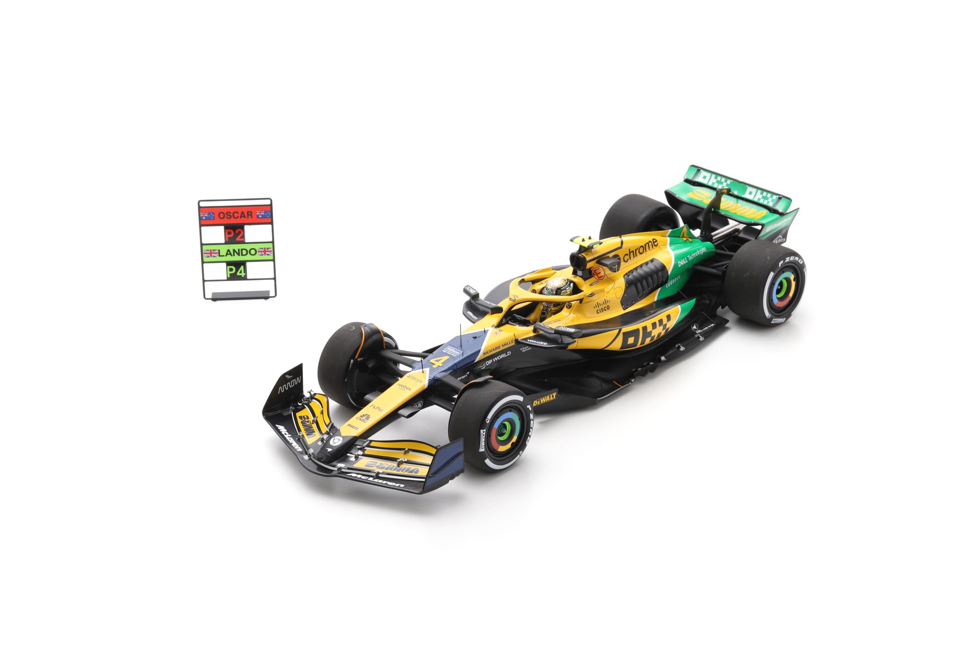 Les McLaren ont marqué leur passage au GP de Monaco 2024 en rendant hommage à Senna six fois vainqueur dans la Principauté avec une livrée spéciale, quelques citations d’Ayrton inscrites autour du cockpit et le panneau résultats. Ici en version Piastri, elle est également disponible dans la variante Norris (réf. S9538) ainsi qu’au 1/18 (réf. 18S998 et 18S997).