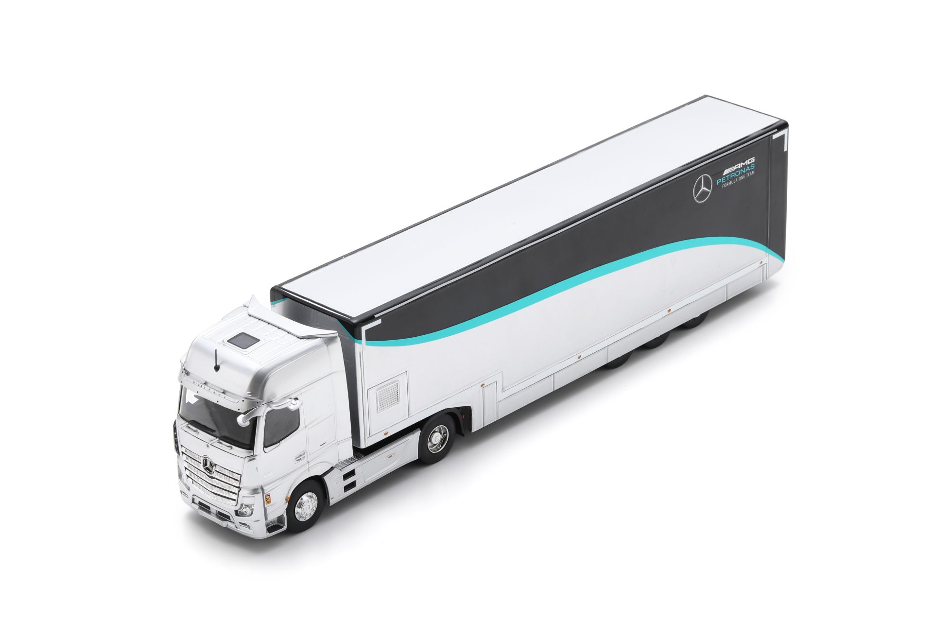 Certes Spark compte déjà une bonne quinzaine de camions transporteurs dans sa gamme, mais c’est avec un décalage certain qu’apparaît le semi-atelier de l’équipe Mercedes-AMG Petronas F1 utilisé durant la saison 2023. De quoi ‘’casser’’ l’uniformité de certaines étagères.