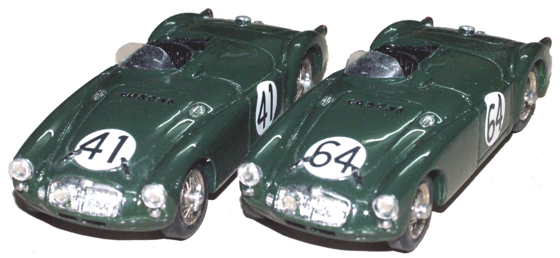 Engagées par MG Cars, ces deux Type EX 182 ont réussi de belles des 24 Heures du Mans 1955. La n°41 de Ken Miles-Johnny Lockett a terminé 13ème quatre rangs devant la n°64 de Ted Lund et Hans Waeffler. Rappelons qu’il s’agit de kits résine équipés de roues à rayons avec la carrosserie et le châssis prépeints et que les pneus sont en caoutchouc.