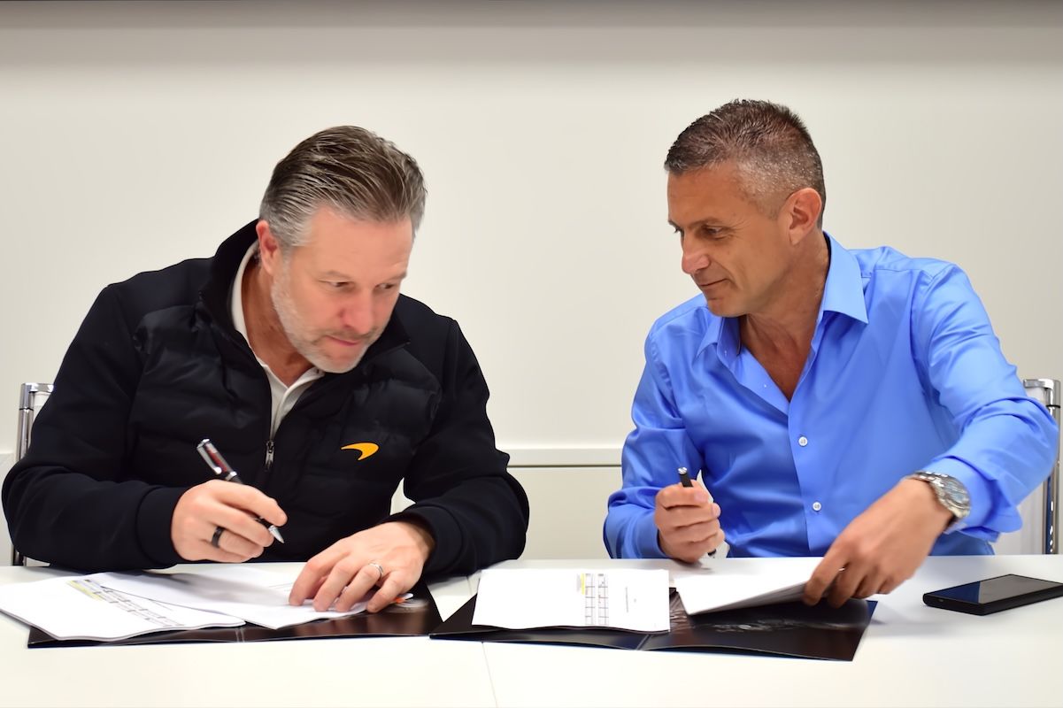 - WEC - Suite à l'annonce faite pendant la semaine des 24 Heures du Mans 2025, le partenariat qui voit ATM-Autotecnica Motori soutenir McLaren Racing dans son programme Hypercar a été officiallisé la semaine passée. L'accord a été signé au siège d'ATM par Zak Brown, PDG de McLaren Racing, et Giovanni Delfino, PDG d'ATM, en présence de James Barclay, directeur exécutif de McLaren Endurance Racing. « C'était formidable de voir hier les progrès réalisés sur notre Hypercar 2027 en rendant visite à l'équipe qui travaille sur le moteur, puis à notre fournisseur de châssis Dallara, en compagnie de notre directeur d'équipe James Barclay, a fait savoir Zak Brown. Merci à Autotecnica Motori pour cette excellente collaboration. Nous sommes impatients de voir la voiture sur la piste ! »