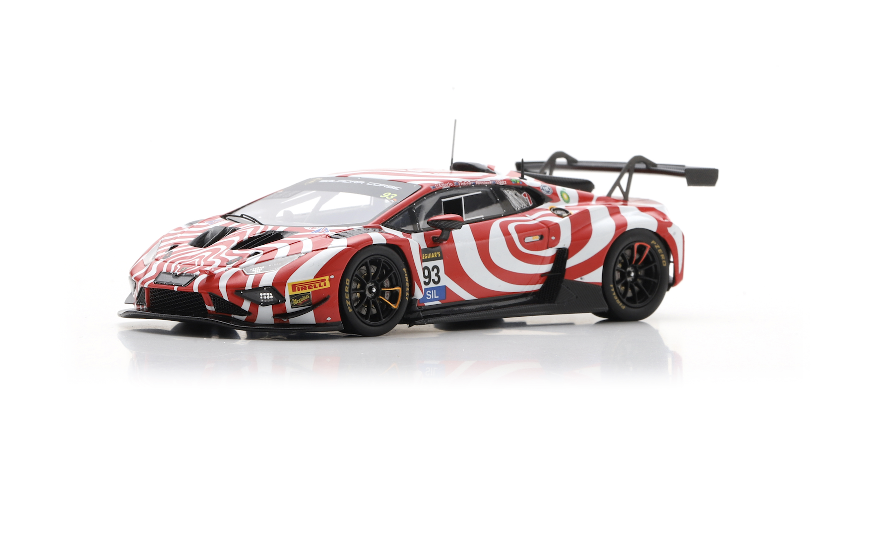 Parmi les trois miniatures proposées, la version engagée par Wall Racing lors des 12 Heures de Bathurst 2025 attire immédiatement l’attention. Arborant une livrée rouge et blanche au style psychédélique et dépourvue de sponsors, la voiture s’est illustrée en remportant la classe Silver.