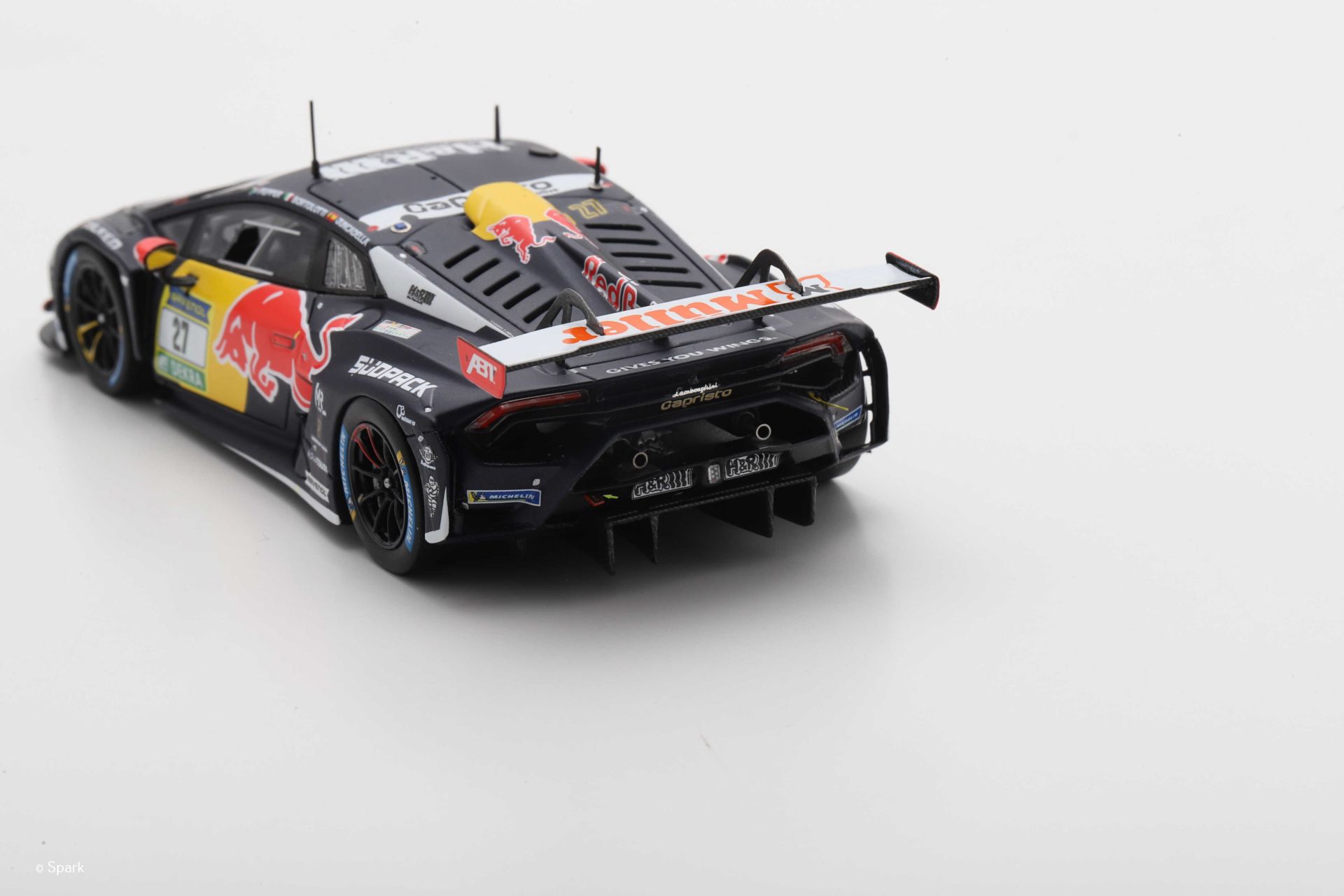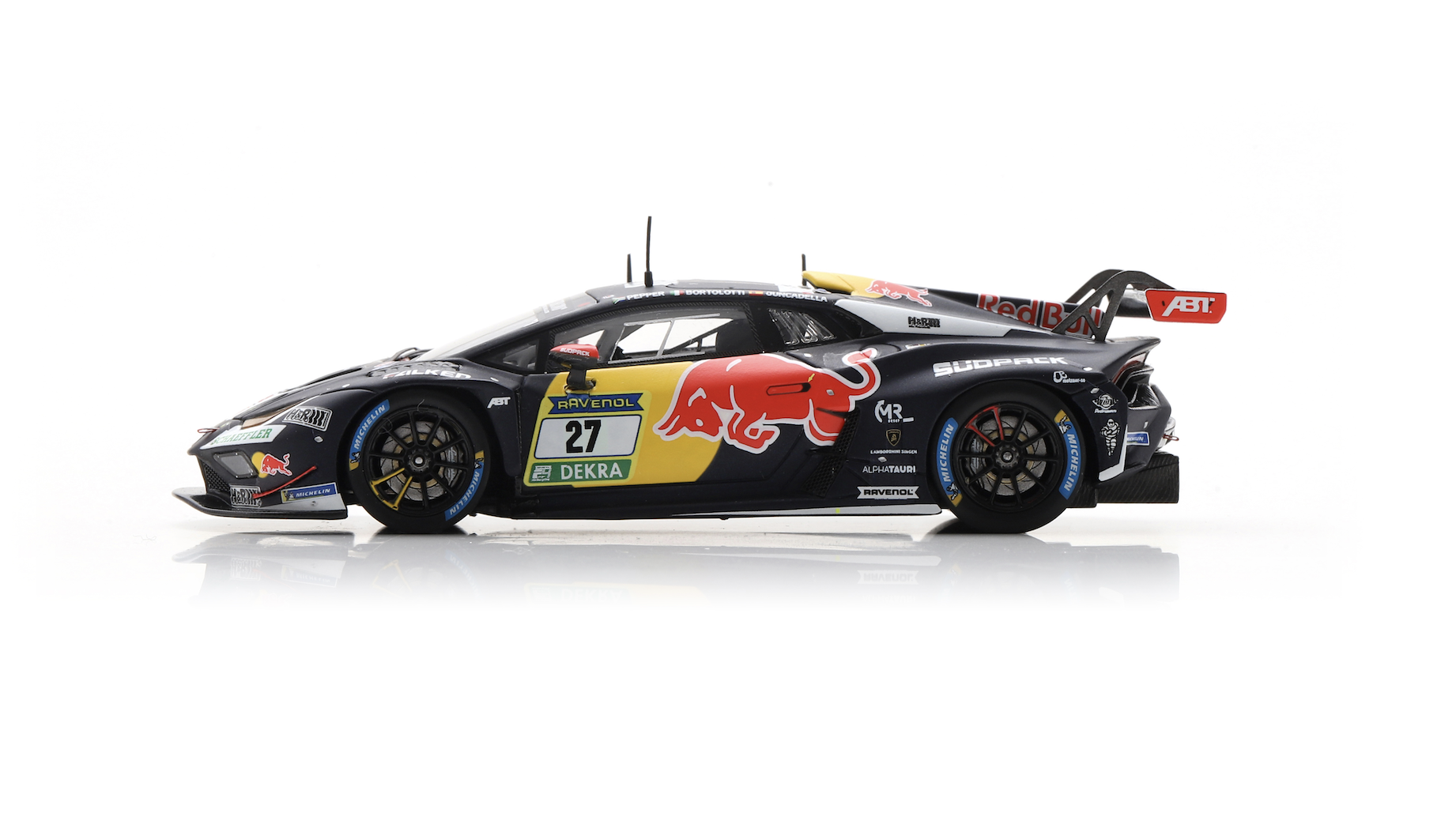 La seconde, la n°27 engagée sous la bannière Red Bull Team Abt, n’a malheureusement pas vu l’arrivée malgré un plateau de pilotes prestigieux réunissant Mirko Bortolotti, Daniel Juncadella et Jordan Pepper. Sa livrée inspirée de la célèbre marque autrichienne lui confère toutefois une forte dimension iconique.