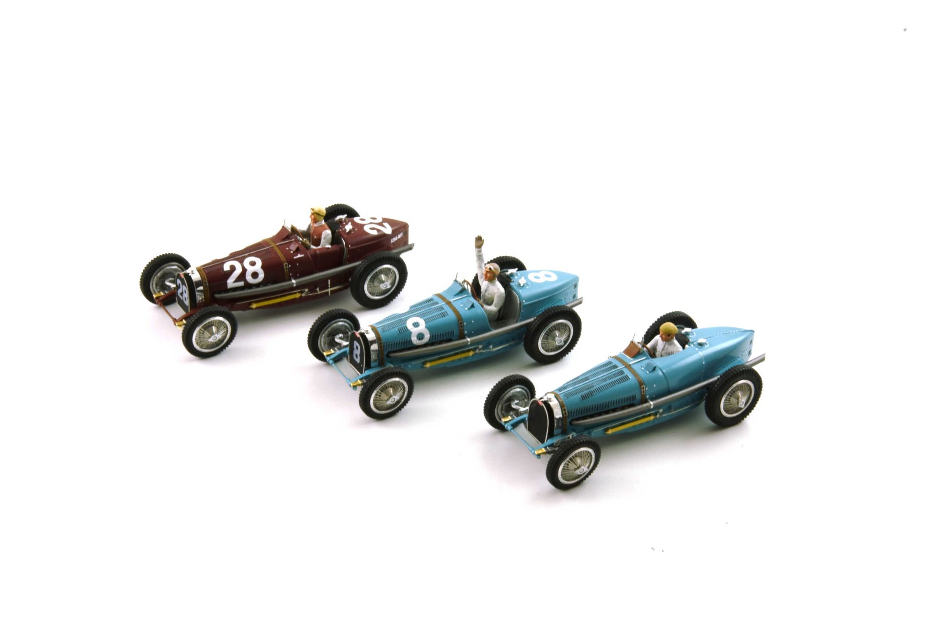 Le Mans Miniatures retrouve le 1/43 avec une série de Bugatti T59 basée sur la reproduction du châssis 59124 exposé à Rétromobile en 2016. Une première version ‘’ standard ’’ (réf. 143106M/LB) se reconnait par l’absence de numéro de course et un pilote portant une casquette. Les deux autres modèles ont participé au GP de Monaco 1934. Avec un réservoir d’essence additionnel sur la gauche du cockpit, la rouge n°28 a vu Tazio Nuvolari (réf. 143106/28M) terminer cinquième. La bleue n°8 (réf. 143106/8M) est celle de René Dreyfus, troisième d’où le geste de son pilote. Des modèles en résine, disponibles seulement montés.