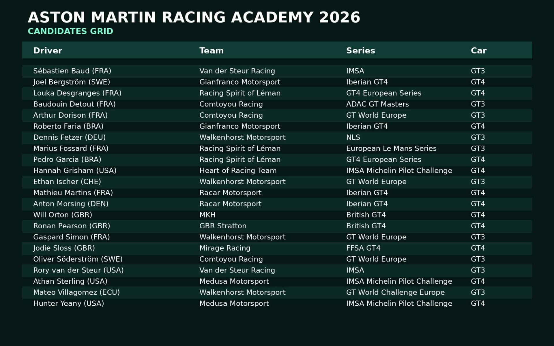 Dans le même temps, Aston Martin ouvre une nouvelle promotion. Vingt-deux pilotes, issus de dix pays, seront engagés en 2026 au sein d’au moins dix équipes partenaires de la marque. Un vivier dense, réparti entre structures de premier plan comme Walkenhorst Motorsport ou Racing Spirit of Léman, et équipes GT4 en pleine ascension.