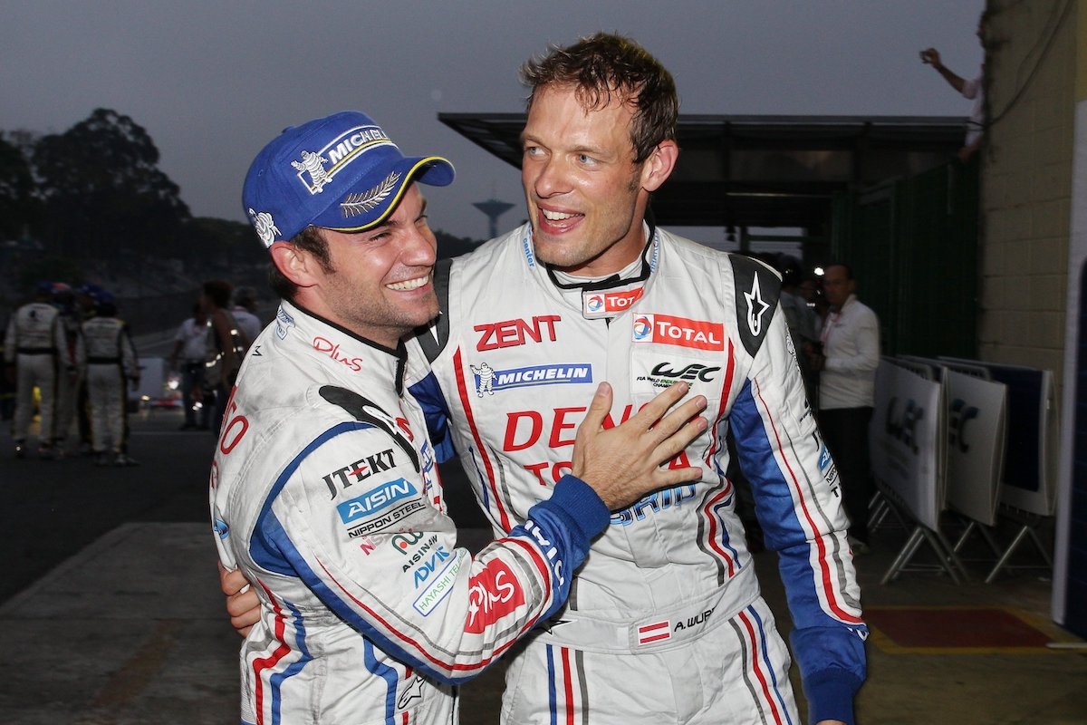 Nico Lapierre et Alex Wurz après avoir offert à Toyota sa première victoire en WEC, à Sao Paulo, en 2012 - © Toyota