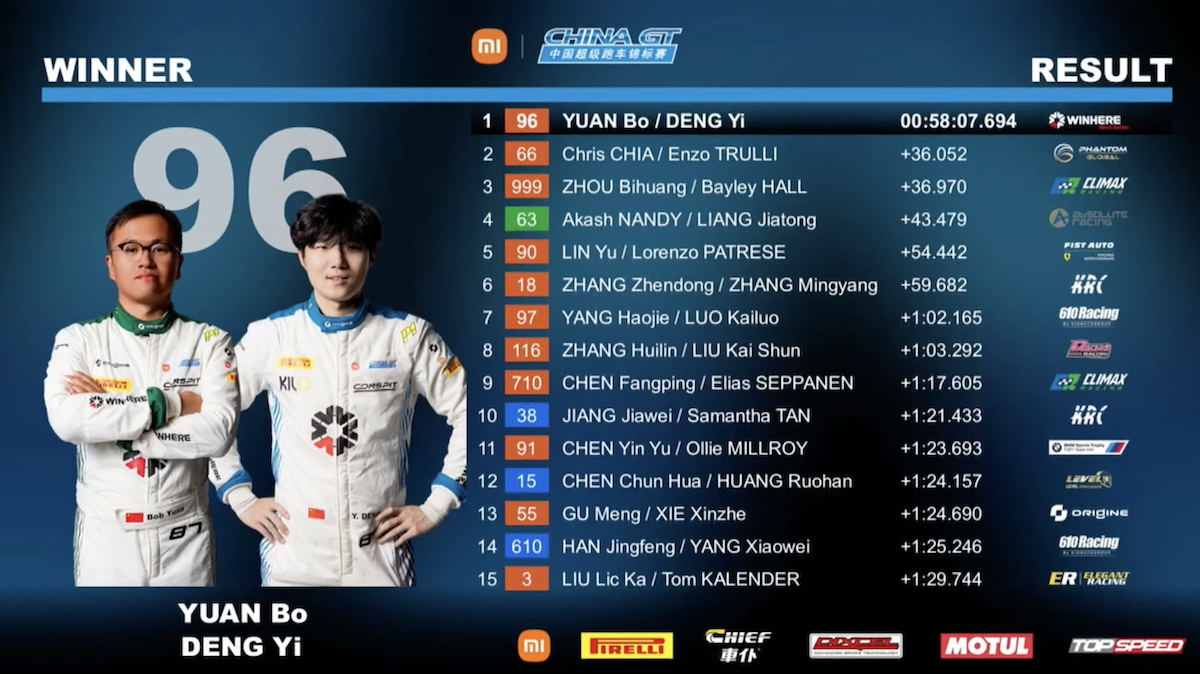 Dès lors, Bo Yuan s'envole vers une victoire autoritaire et devance sous le damier Chris Chia, revenu en deuxième position avec la Porsche n°66 - Phantom Global Racing partagée avec Chris Chia. Bihuang Zhou et Bayley Hall complètent le podium au général et en Pro-Am avec la Mercedes n°999 - Climax Racing.
