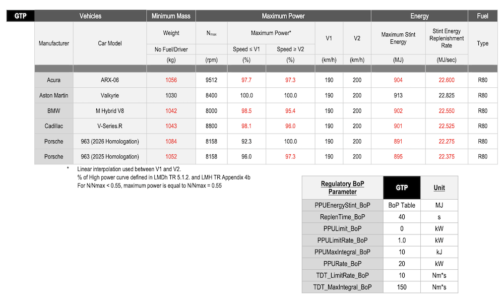 Les BMW et Cadillac perdent en revanche de la puissance. La M Hybrid V8 cède 0,5% et 1,5% sur les deux étages, la V-Series.R perdant 0,2% et 1,1%. La Porsche 963 version 2025 récupère 1,3% après 200 km/h. Aucun changement sur ce plan pour la 963 version 2026 et la Valkyrie, qui demeure toujours avec sa puissance maximale.