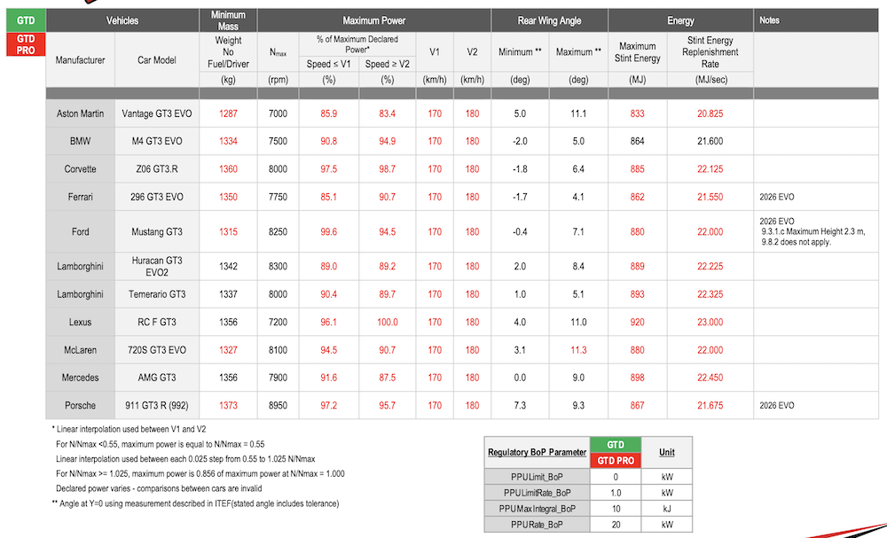 En GTD PRO / GTD, huit des dix GT3 présentes voient leur masse totale modifiée. L'Aston Martin Vantage GT3 est la plus impactée, dans le bon sens, avec une réduction importante de 41 kg (de 1 328 à 1 287 kg). La Ford Mustang GT3 EVO perd 15 kg (à 1 315 kg), la BMW M4 GT3 EVO 12 kg (à 1 334 kg) et la Porsche 911 GT3 R EVO 11 kg (à 1 373 kg) pour les réductions les plus conséquentes.