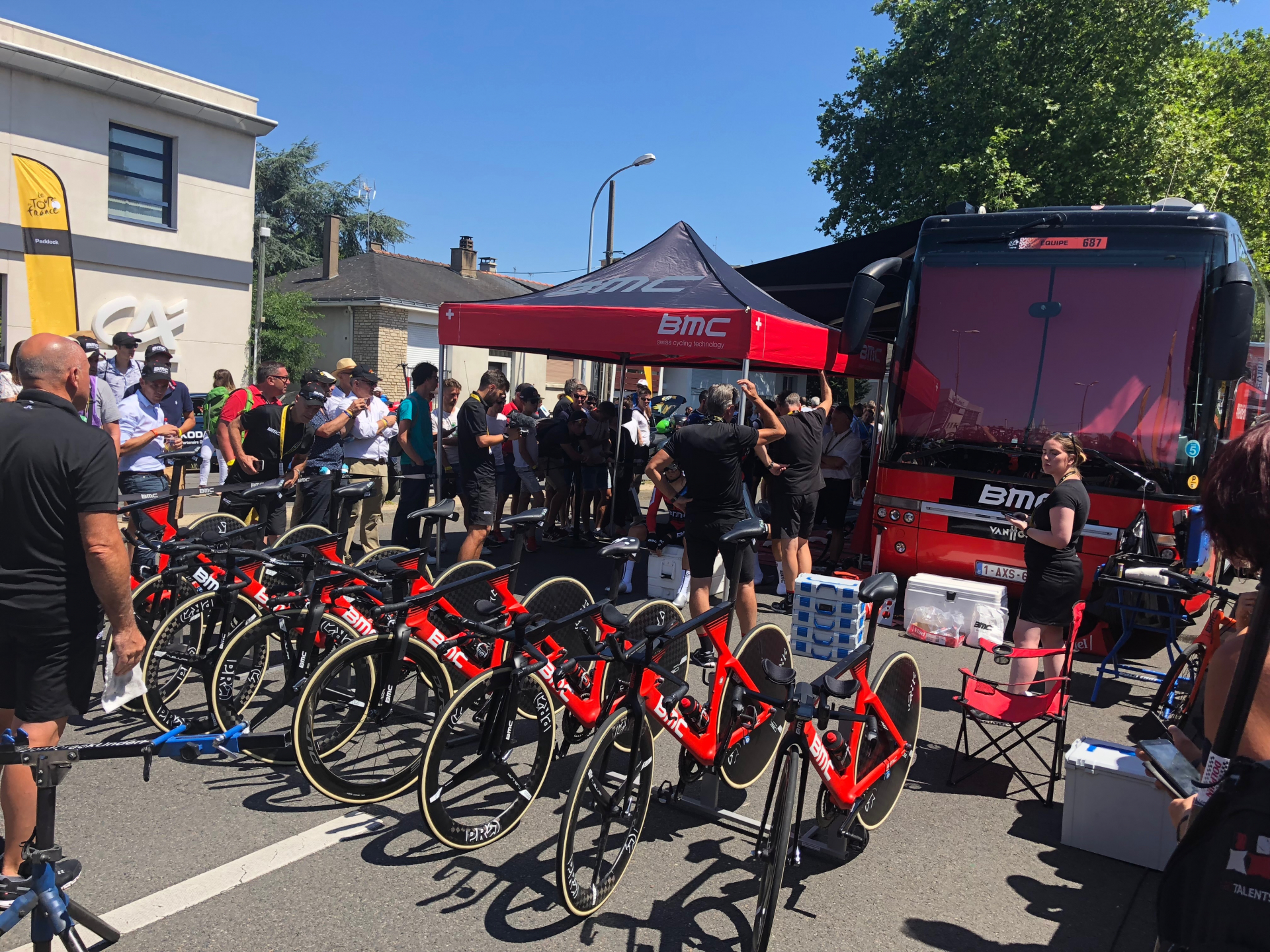 L'étape du CLM par équipe a la particularité de démarrer et de se terminer à quelques mètres d'intervalle. Avoir un pass média du Tour de France est quand même un rêve de gosse, comme pour les 24 Heures du Mans. J'ai le souvenir que lorsque j'ai mis les pieds pour la première fois dans la voie des stands au Mans avec un billet pitwalk, j'ai appelé la terre entière pour dire que j'étais de l'autre côté de la barrière. Bon, là je ne suis pas allé jusque-là mais quand même...