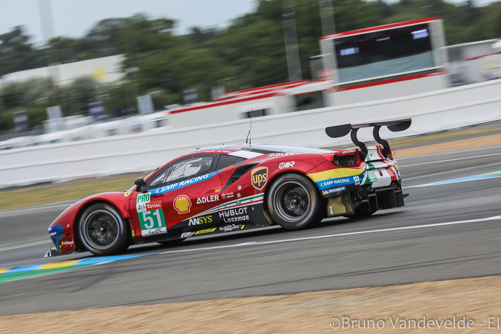 La Ferrari #51 AF Corse (James Calado) est leader en GTE Pro et devance les Porsche #91 et #93. Les quatre Ford GT suivent ! Quid de la Corvette ? La C7.R #63 de Jan Magnussen est sortie de la piste aux Virages Porsche, a légèrement touché et a dû repasser par son stand. Elle est 8e. Plus que quatre autos dans le même tour !