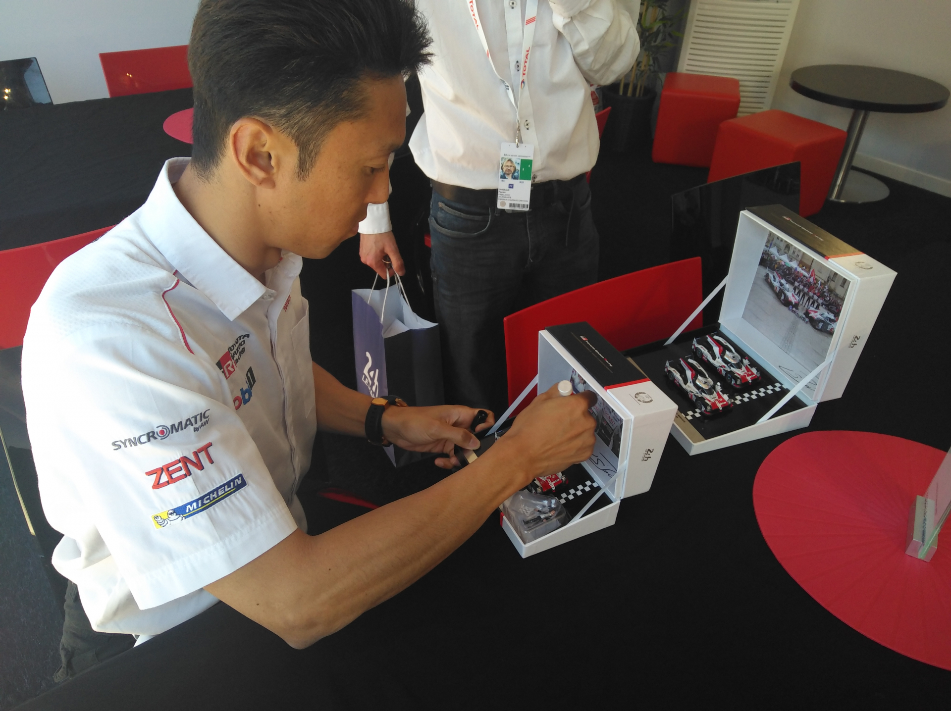 Kazuki Nakajima est toujours aussi populaire. Le pilote japonais, lauréat des dernières 24 Heures du Mans, a signé pas mal d'autographes et des miniatures.