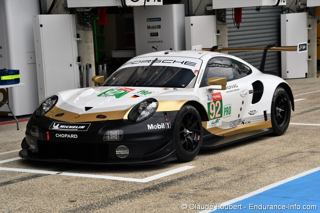 Porsche avait dévoilé aujourd'hui la livrée des Porsche 911 RSR qui participent au Championnat FIA WEC, avec des bandes dorées. Les deux voitures, la #91 et la #92 arborent déjà fièrement cette nouvelle décoration sur la voie des stands.