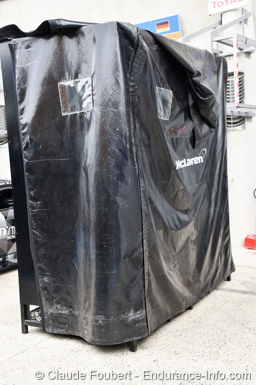 McLaren est-il en repérages? Une caisse noire au logo de la marque est installée devant les premiers stands...