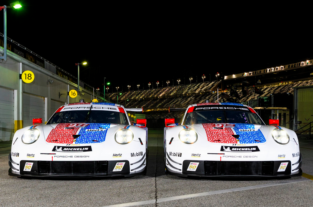 C'est une livrée Brumos Racing qui a inspiré Porsche. L'équipe américaine s'est imposée à quatre reprises à Daytona. La première victoire remonte à 1973 avec la Porsche 911 Carrera de Peter Gregg et Hurley Haywood. Bis repetita deux ans plus tard avec le même équipage sur une 911 Carrera RSR. Trois ans plus tard, c'est la 935 Turbo de Rolf Stommelen, Peter Gregg et Toine Hezemans qui s'imposait en Floride. Le dernier succès remonte à 2009 avec la Riley à moteur Porsche de Antonio Garcia, David Donohue, Buddy Rice et Darren Law. Porsche compte 18 victoires aux 24 Heures de Daytona.Les deux Porsche 911 RSR garderont ces couleurs pour les 12 Heures de Sebring.