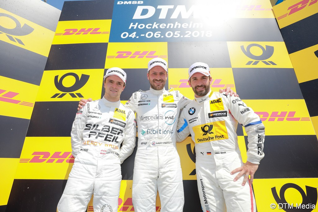 Timo Glock réussissait à compléter le podium, au milieu de la meute des Mercedes-AMG: Mortara (Mercedes-AMG SILBERPFEIL Energy #48) terminait quatrième, Pascal Wehrlein (Mercedes-AMG PETRONAS #94), cinquième, Paul Di Resta (Mercedes-AMG REMUS #3) septième et Daniel Juncadella (Mercedes-AMG REMUS #23). Bruno Spengler (BMW Team RBM #7) a réussi à s'immiscer à la sixième place, alors que la meilleure Audi RS 5 DTM est l'Audi Team Rosberg #33) de René Rast, champion DTM sortant, juste devant Loïc Duval (Audi Team Phoenix #28) qui termine donc dans le Top 10. C'est une course à oublier pour Audi.